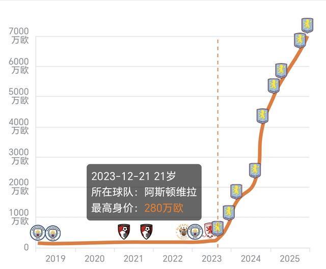 2024年2月,阿斯頓維拉以940萬歐元轉(zhuǎn)會費將其簽下,他在埃梅里的悉心調(diào)教下迅速成長,從首賽季的16場3球1助,到上賽季54場14球13助上雙,本賽季更是成為了球隊重要的爭冠核心!
