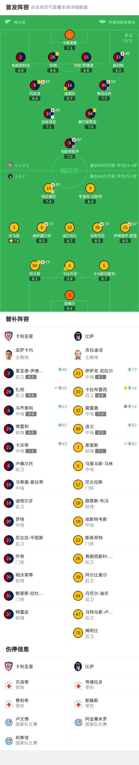 第59分鐘,卡利亞里球員扎帕助攻弗洛倫肖打入一球。
